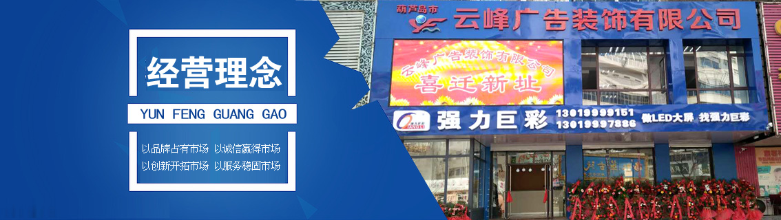 葫蘆島市云峰廣告裝飾有限公司自創(chuàng)立以來,一直致力于廣告牌的設(shè)計(jì),噴繪,制作,安裝、LED工程、亮化工程、數(shù)碼圖文、圍擋制作安裝、三面翻廣告、大型擎天柱廣告、草坪牌、指示牌、雕刻背景墻、燈箱設(shè)計(jì)、標(biāo)識(shí)標(biāo)牌、金屬制品、亞克力字、展臺(tái)展柜、取款機(jī)隔斷、取款機(jī)隔斷等一體化服務(wù),是葫蘆島市噴繪行業(yè)大規(guī)模實(shí)業(yè)公司。